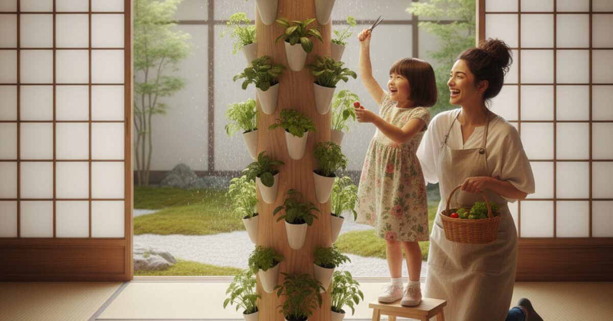- 都市部でも縦型タワー設置により自宅で新鮮野菜を持続的に収穫できる